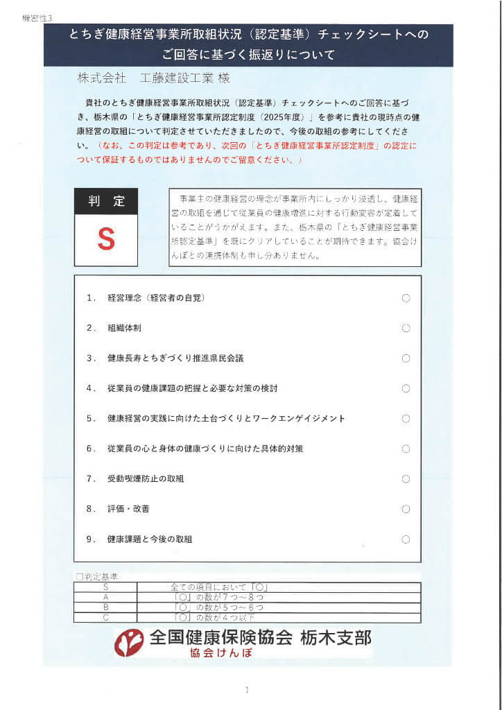 先日認定の更新を行ったとちぎ健康ですが、その際に提出していたチェックシートの結果が届きました!