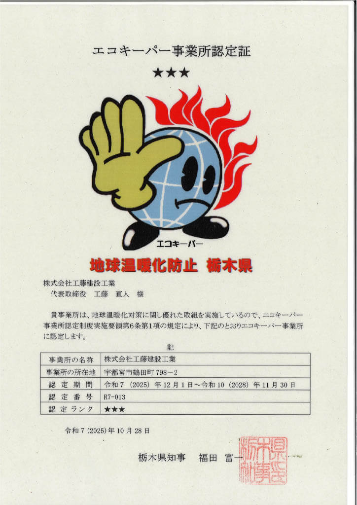 エコキーパー事業所認定とは地球温暖化対策に関して取組をおこなっている事業所に3段階評価で栃木県から認定していただく制度です。